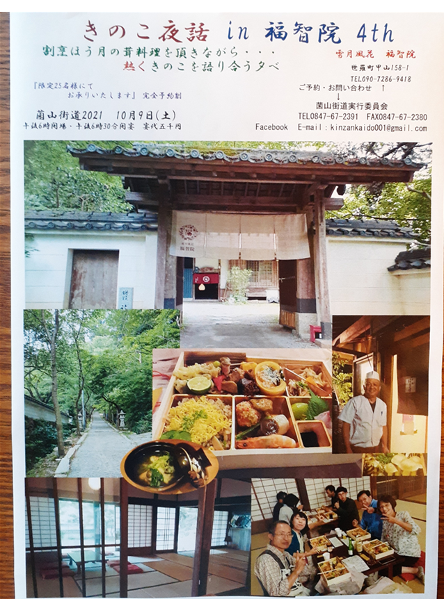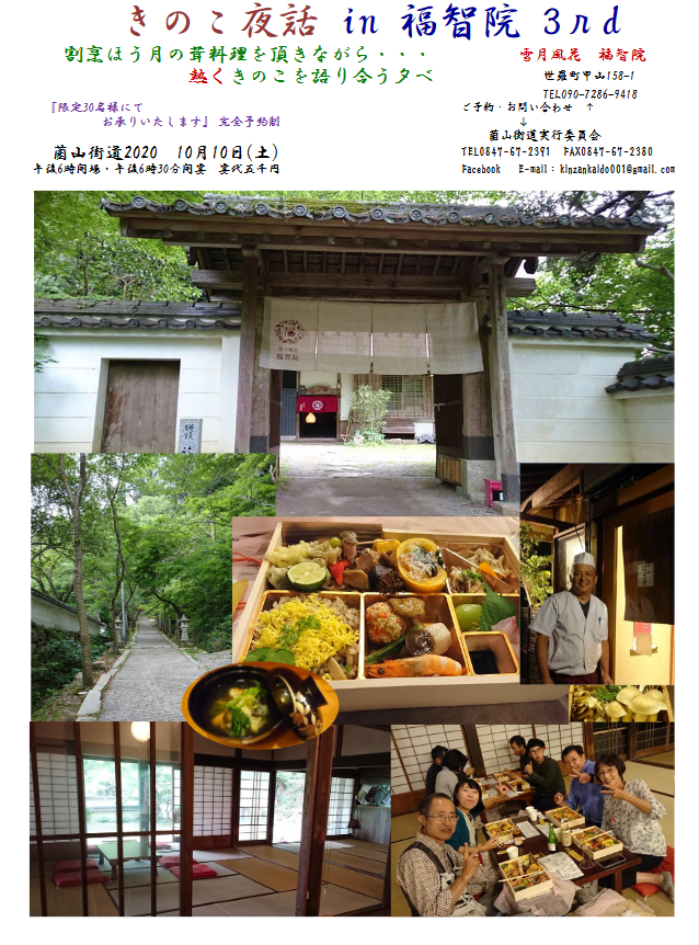 きのこ夜話in福智院4th きのこ夜話in福智院4th 築170年の宿坊カフェで、割烹ほう月の茸懐石弁当と特製椀物を頂きながら、熱くきのこを語り合う夕べ・・・🍄🍱 定員25名 参加費5千円 完全予約制 ご予約は福智院☎090-7286-9418 or菌山街道実行委員会まで (☎0847-67-2391、fax0847-67-2380、Facebook、e-mail) 尚、コロナ対策のため検温、マスク着用でお越し下さい🙇